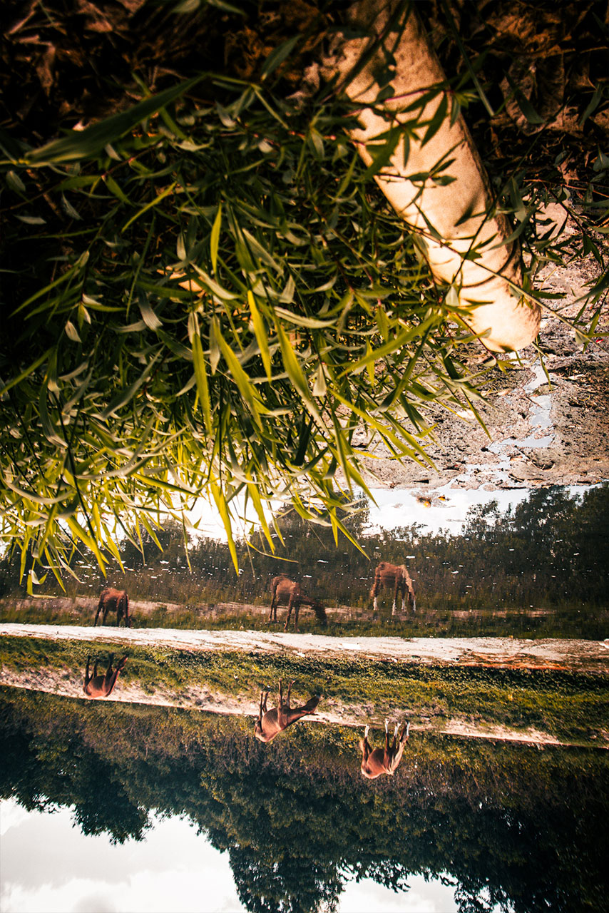 08 — Cavalos pastando na área rural, entre rio e mata.